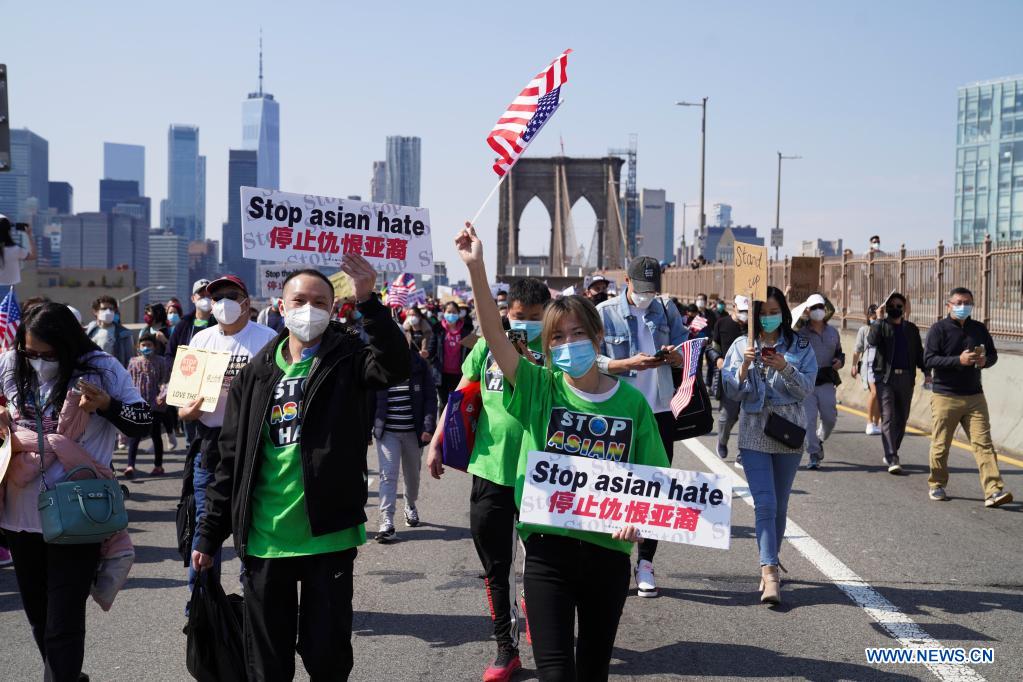 NEW YORK, 4 avril (Xinhua) -- Plus de 10.000 Américains d'origine asiatique se sont rassemblés à New York dimanche pour une manifestation intitulée "Stop-Asian-Hate".