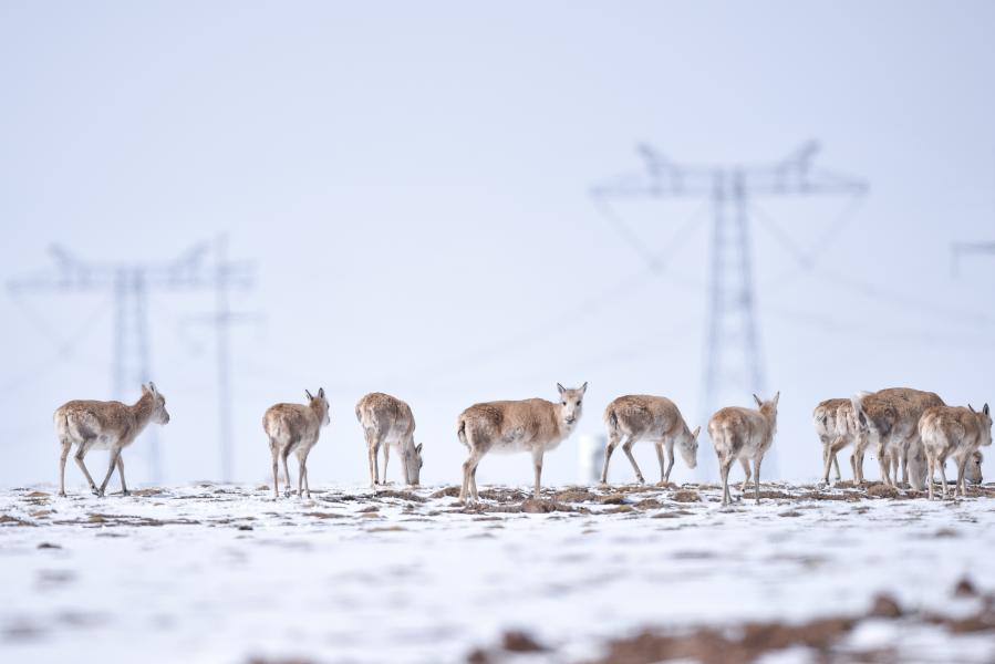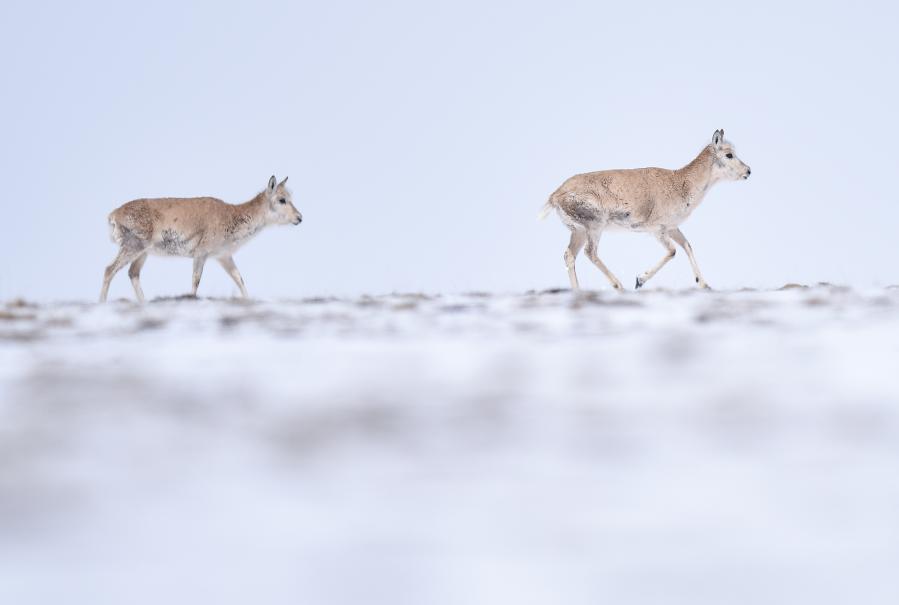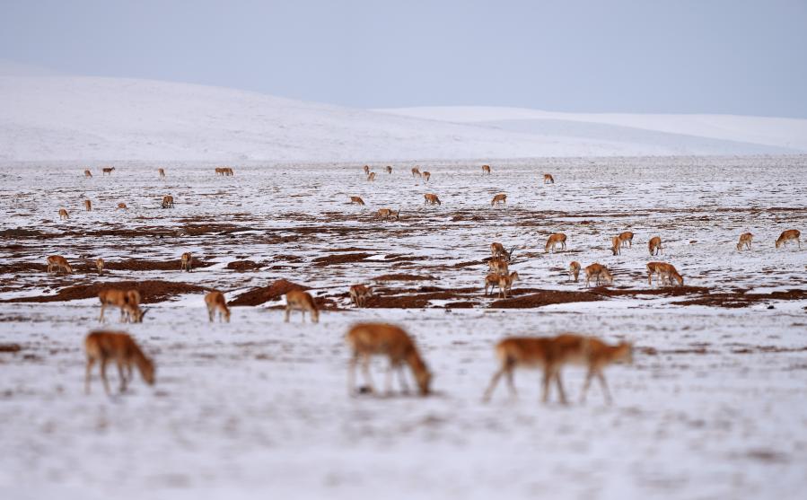 YUSHU, 22 avril (Xinhua) -- De nombreuses antilopes tibétaines ont afflué dans la zone de Wudaoliang durant de récentes chutes de neige à Hoh Xil, se préparant pour leur migration. Le lac Zonag à Hoh Xil est connu comme la "salle d'accouchement" de cette espèce.