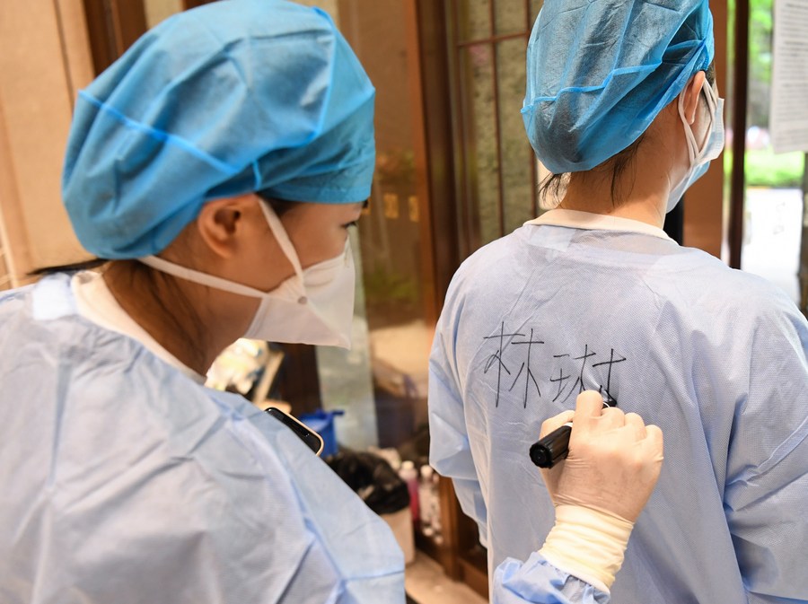 Une bénévole chargée de livrer des produits de première nécessité aux habitants en quarantaine à domicile aide une autre bénévole à écrire son nom sur sa tenue de protection, dans un quartier de l'arrondissement de Liwan à Guangzhou, capitale de la province du Guangdong (sud), le 2 juin 2021. (Photo : Deng Hua)