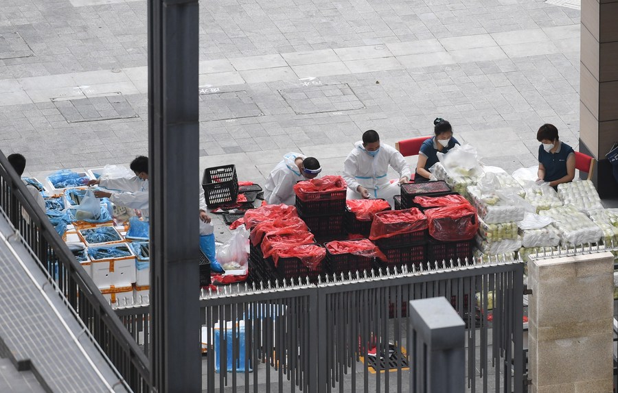Des membres du personnel d'une société de gestion immobilière (à droite) distribuent les produits commandés en ligne par des habitants en quarantaine aux bénévoles, dans un quartier de l'arrondissement de Liwan à Guangzhou, capitale de la province du Guangdong (sud), le 2 juin 2021. (Photo : Deng Hua)