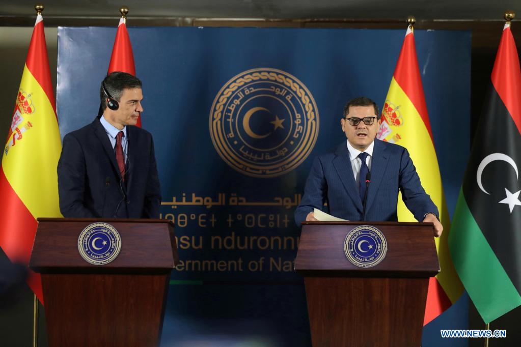 TRIPOLI, 3 juin (Xinhua) -- Le Premier ministre libyen Abdul Hamid Dbeibah a rencontré jeudi son homologue espagnol Pedro Sanchez, avec qui il a discuté des moyens à leur disposition pour renforcer les relations bilatérales entre les deux pays, a annoncé le gouvernement libyen dans un communiqué.