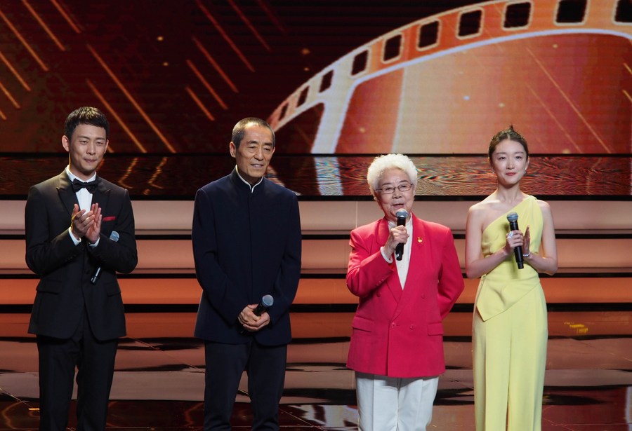 Les actrices Tian Hua (deuxième à droite), Zhou Dongyu (première à droite), l'acteur Zhang Yi (premier à gauche) et le réalisateur Zhang Yimou (deuxième à gauche) partagent leur expérience lors du 24e Festival international du film de Shanghai (FIFS) à Shanghai, dans l'est de la Chine, le 11 juin 2021. (Photo : Ren Long)■
