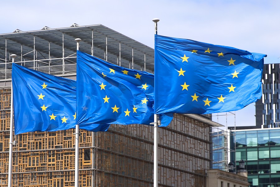 Les drapeaux de l'Union européenne (UE) flottent devant le siège de l'UE à Bruxelles, en Belgique, le 21 mai 2021. (Xinhua/Zheng Huansong)