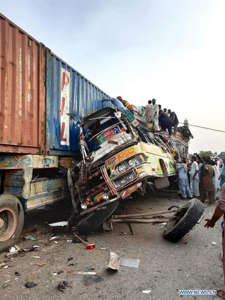 Cet accident s'est produit après que le bus en excès de vitesse est entré en collision avec une remorque près de la déviation de Taunsa dans le district de Dera Ghazi Khan au Pendjab, selon les reportages.
