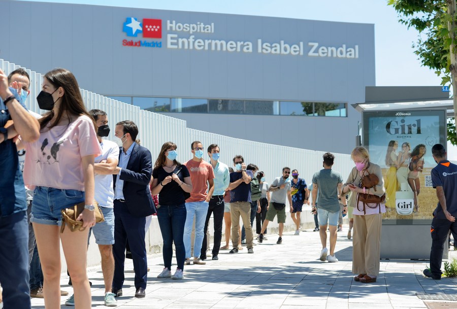 Des gens font la queue pour se faire vacciner contre la COVID-19 devant un hôpital de Madrid, en Espagne, le 7 juillet 2021. (Gustavo Valiente/Xinhua)