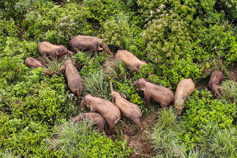 MOJIANG, Yunnan, 14 août (Xinhua) -- Jeudi à 23h48, qui était également la Journée mondiale des éléphants, le troupeau de quatorze éléphants d'Asie sauvages errants qui a attiré l'attention du monde entier est retourné dans son habitat à Mojiang, district de la ville de Pu'er.