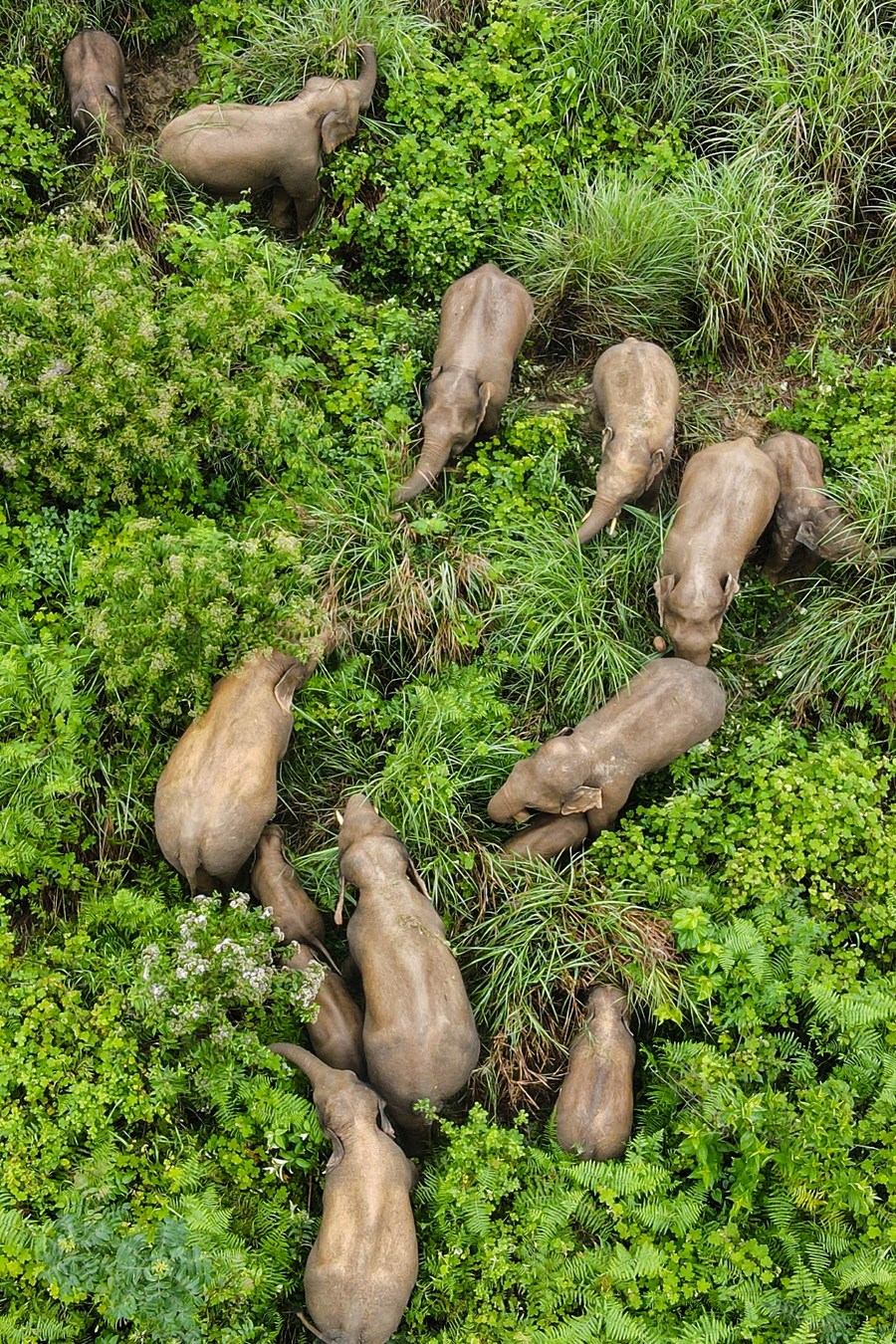 Un troupeau d'éléphants d'Asie sauvages dans le district de Mojiang, à Pu'er, dans la province chinoise du Yunnan (sud-ouest), le 13 août 2021. (Photo : He Yougang)■