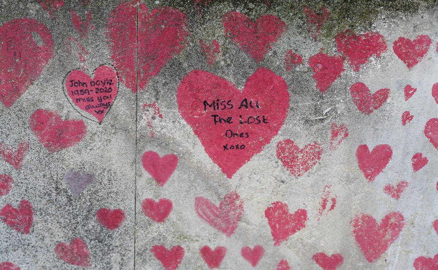 Des coeurs rouges et des messages sur le mur mémorial national en hommage aux victimes de la COVID-19 le long de la Tamise, à Londres, au Royaume-Uni, le 9 août 2021. (Xinhua/Han Yan)