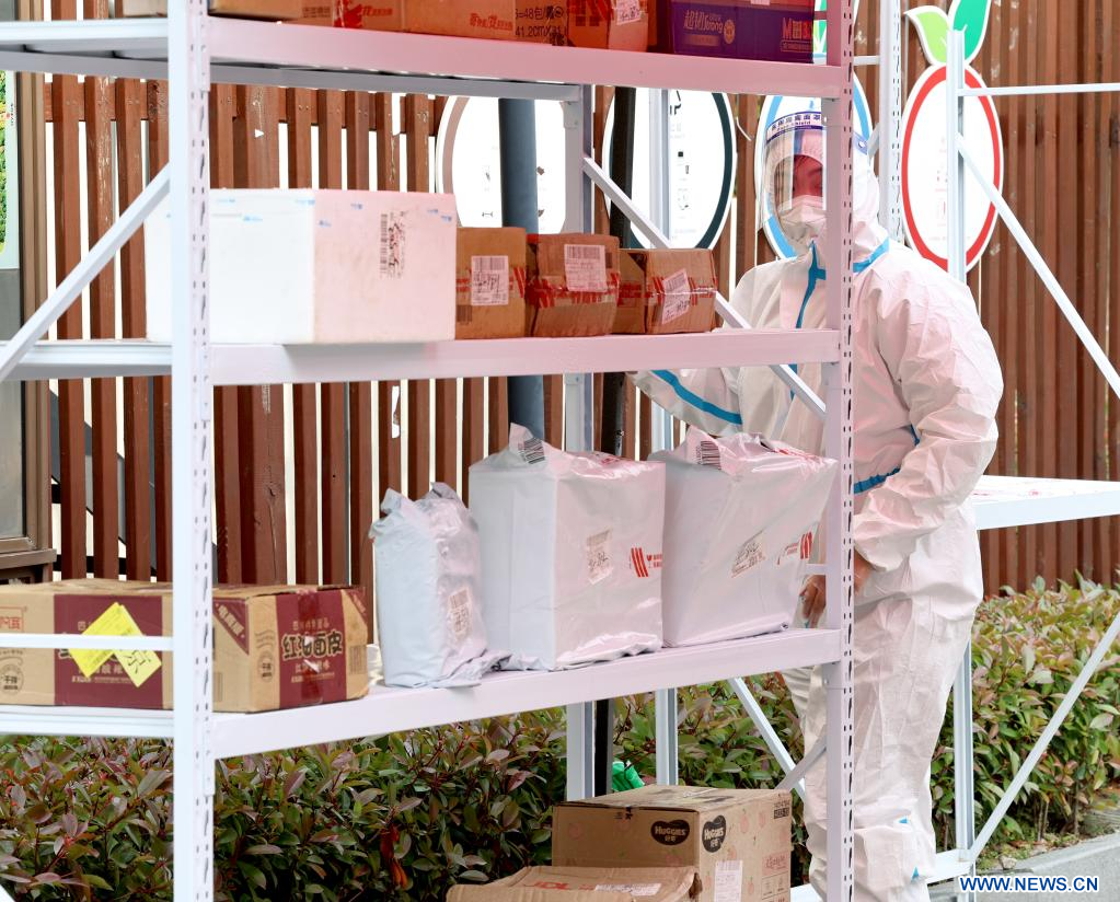 SHANGHAI, 26 avril (Xinhua) -- Un travailleur arrange des colis sur une étagère dans un quartier résidentiel à Shanghai, dans l'est de la Chine, le 25 avril 2022. De nombreux quartiers résidentiels à Shanghai utilisent des véhicules de livraison sans pilote pour distribuer des approvisionnements aux habitants dans le cadre de la résurgence de la COVID-19. (Photo : Chen Jianli)