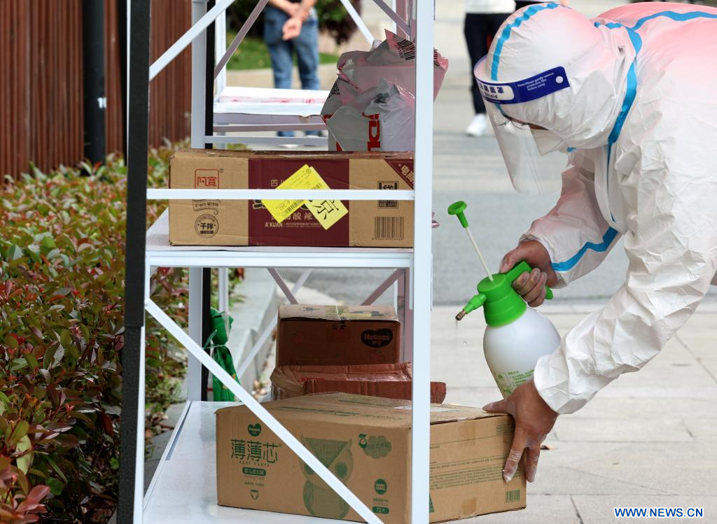 SHANGHAI, 26 avril (Xinhua) -- Un travailleur désinfecte des colis sur une étagère dans un quartier résidentiel à Shanghai, dans l'est de la Chine, le 25 avril 2022. De nombreux quartiers résidentiels à Shanghai utilisent des véhicules de livraison sans pilote pour distribuer des approvisionnements aux habitants dans le cadre de la résurgence de la COVID-19. (Photo : Chen Jianli)