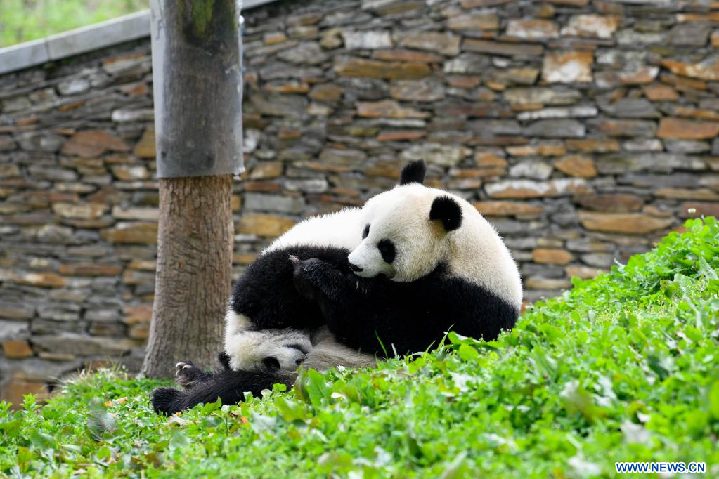 Des pandas géants dans la base de Shenshuping du Centre de protection et de recherche des pandas géants de Chine dans la Réserve naturelle nationale de Wolong, dans la province chinoise du Sichuan (sud-ouest), le 24 avril 2022. (Xinhua/Xu Bingjie)