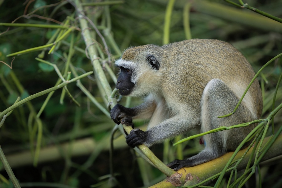 Un singe assis dans un arbre dans le parc national de Tsavo East, près de Voi, au Kenya, le 25 mai 2015. (Xinhua/Pan Siwei)