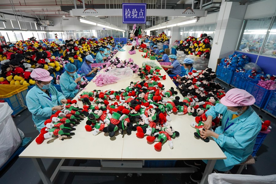 YANGZHOU, 31 mai (Xinhua) -- Une usine de jouets en peluche du village de Jinhuai à Yangzhou, dans la province chinoise du Jiangsu (est), le 26 mai 2022.