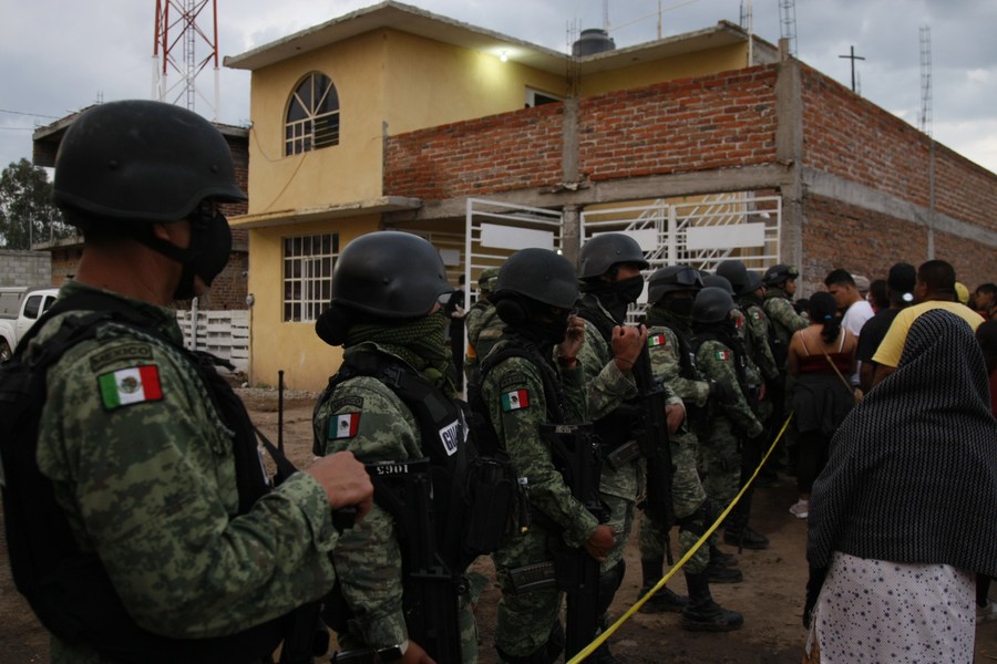 Des membres de la Garde nationale du Mexique montent la garde à l'extérieur du centre de rééducation attaqué par des assaillants armés à Irapuato, dans l'Etat de Guanajuato, au Mexique, le 1er juillet 2020. (Xinhua/Mario Armas)