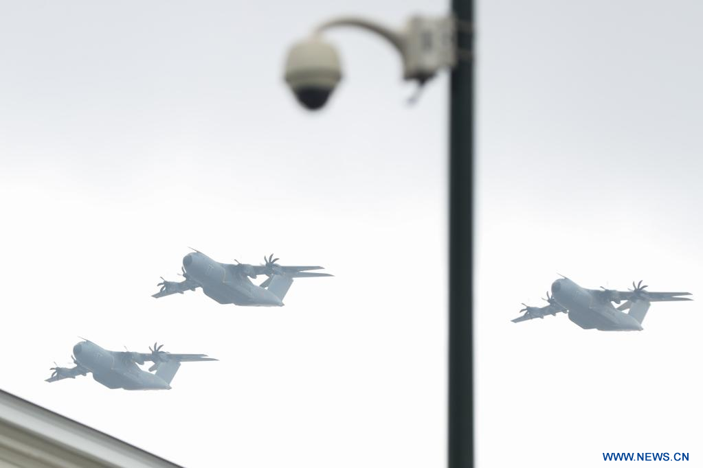 BRUXELLES, 22 juillet (Xinhua) -- Des avions de transport A400M participent au défilé de la fête nationale à Bruxelles, en Belgique, le 21 juillet 2022. (Xinhua/Zheng Huansong)