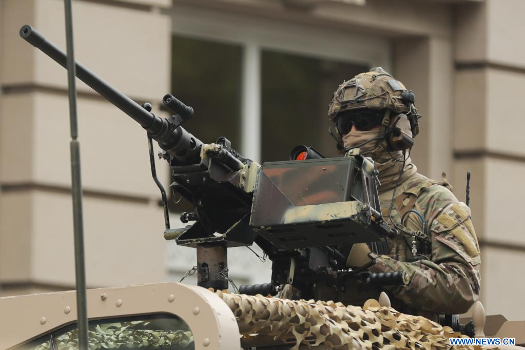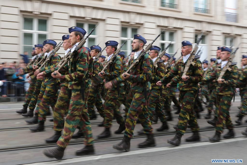 BRUXELLES, 22 juillet (Xinhua) -- Des soldats participent au défilé de la fête nationale à Bruxelles, en Belgique, le 21 juillet 2022. (Xinhua/Zheng Huansong)
