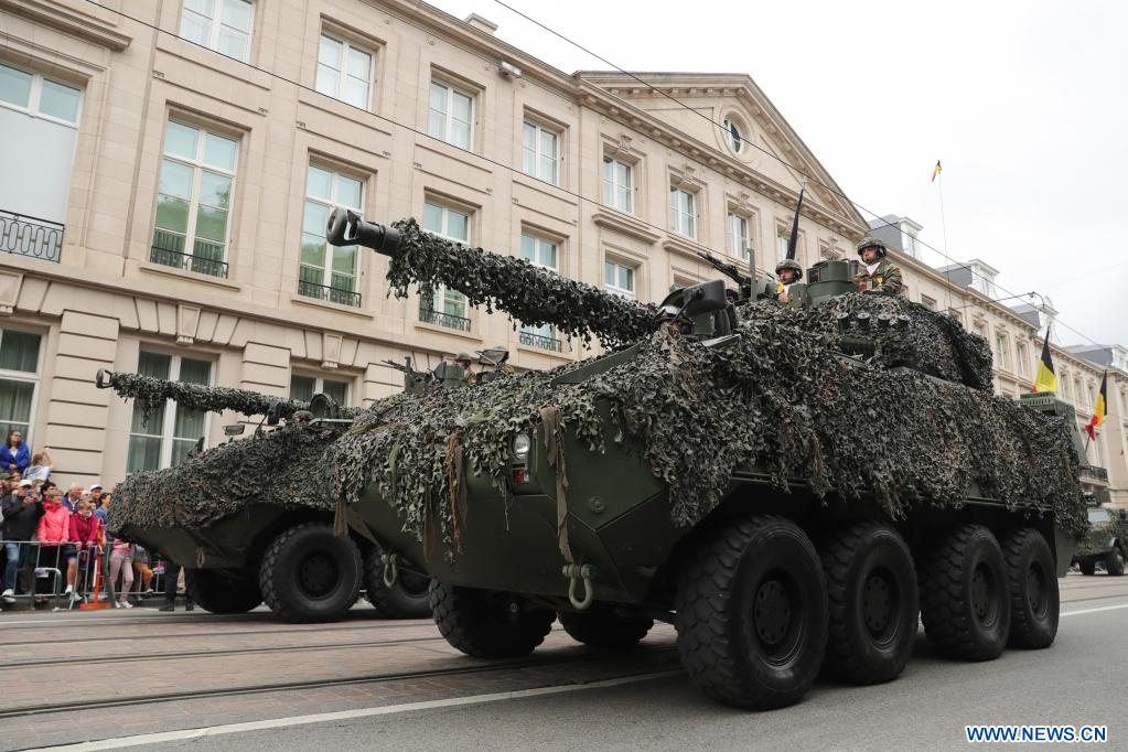 BRUXELLES, 22 juillet (Xinhua) -- Des blindés Piranha DF90 participent au défilé de la fête nationale à Bruxelles, en Belgique, le 21 juillet 2022. (Xinhua/Zheng Huansong)