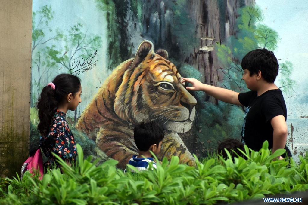 LAHORE, 30 juillet (Xinhua) -- Des enfants regardent une peinture d'un tigre dans un zoo à Lahore, au Pakistan, lors de la Journée internationale du tigre, le 29 juillet 2022. (Xinhua/Sajjad)