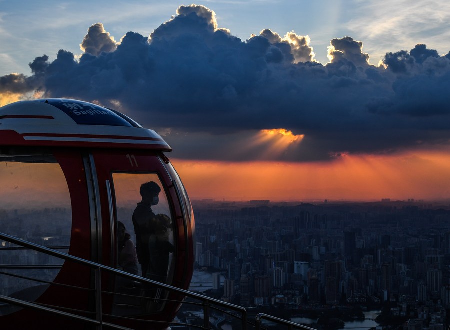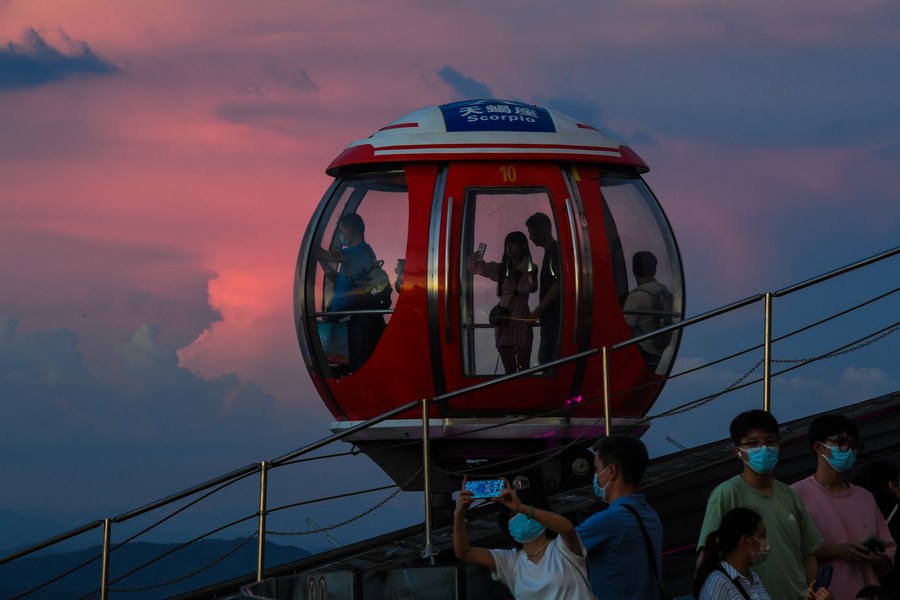 Des gens dans la grande roue sur le toit de la Tour de Guangzhou, monument emblématique de Guangzhou, dans la province chinoise du Guangdong (est), le 7 août 2022. (Photo : Liu Dawei)