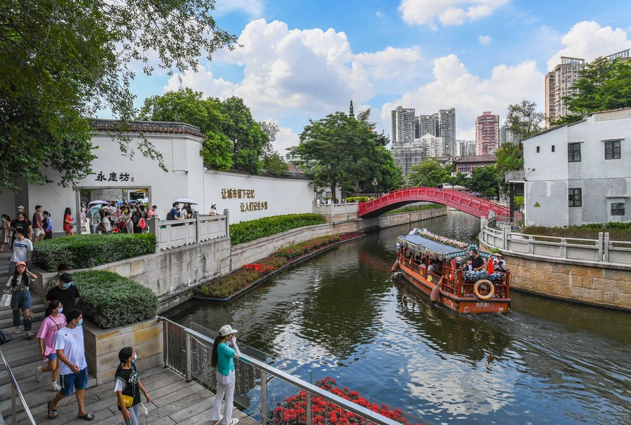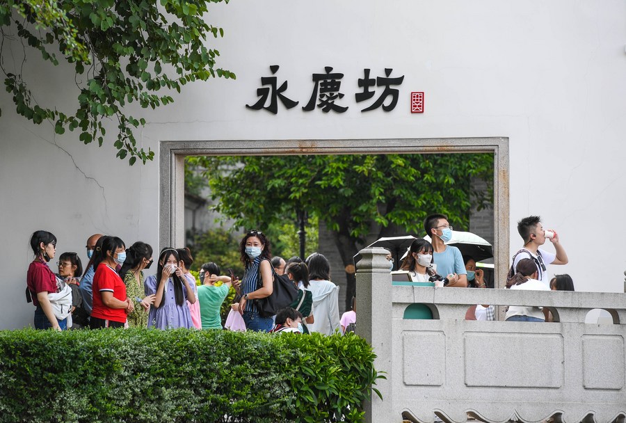 Des gens visitent les ruelles historiques de Yongqing Fang, à Guangzhou, dans la province chinoise du Guangdong (est), le 7 août 2022. (Photo : Liu Dawei)