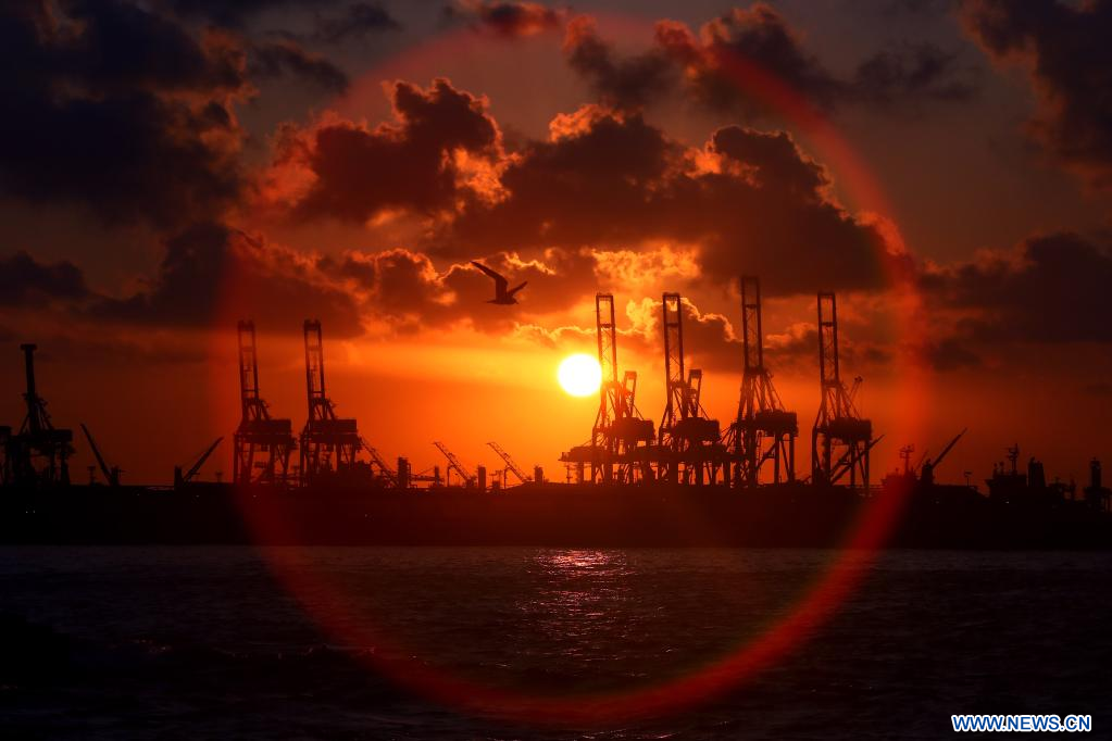 ALEXANDRIE (Egypte), 13 août (Xinhua) -- Photo prise le 13 août 2022 montrant le coucher du soleil au port d'Alexandrie, en Egypte. (Xinhua/Ahmed Gomaa)