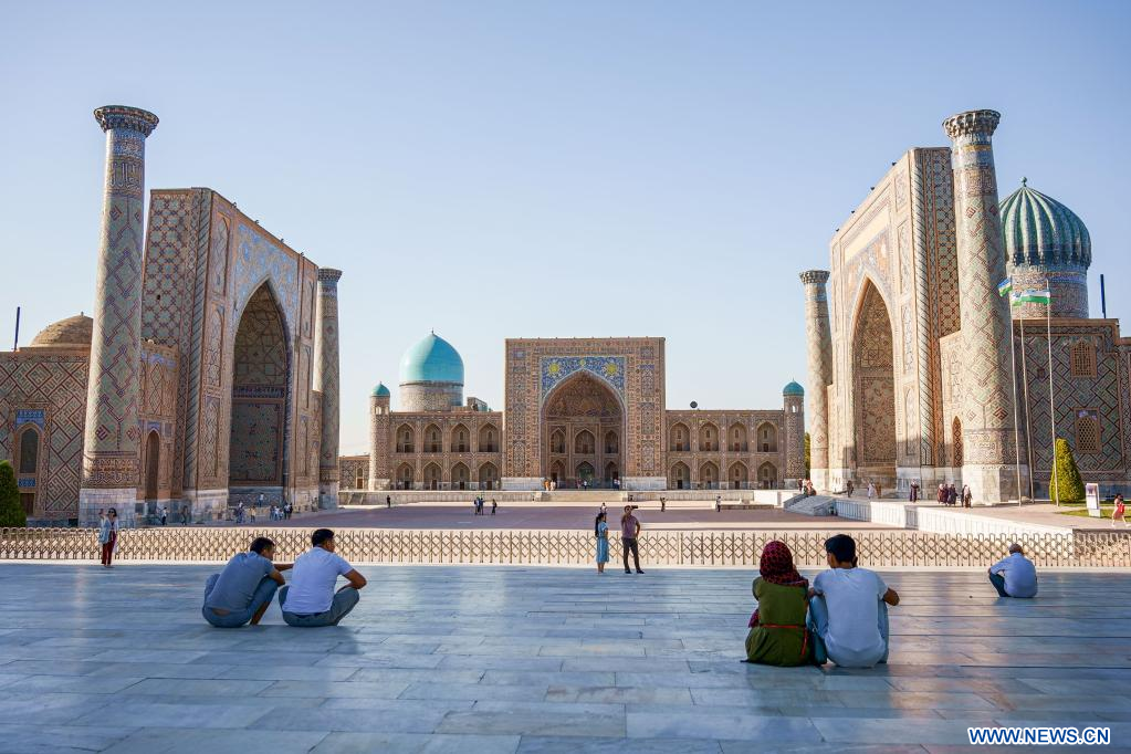 SAMARCANDE, 13 septembre (Xinhua) -- Des gens visitent la place du Régistan, à Samarcande, en Ouzbékistan, le 3 septembre 2022. Samarcande est la deuxième plus grande ville d'Ouzbékistan. Située sur l'ancienne Route de la Soie, cette ville constitue un carrefour des cultures du monde. (Xinhua)