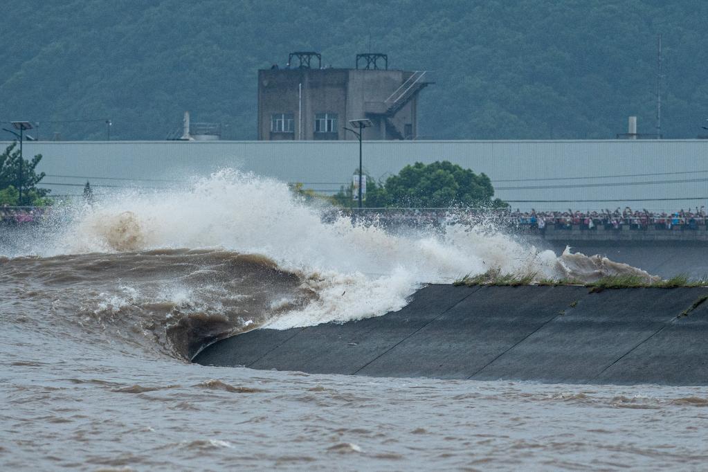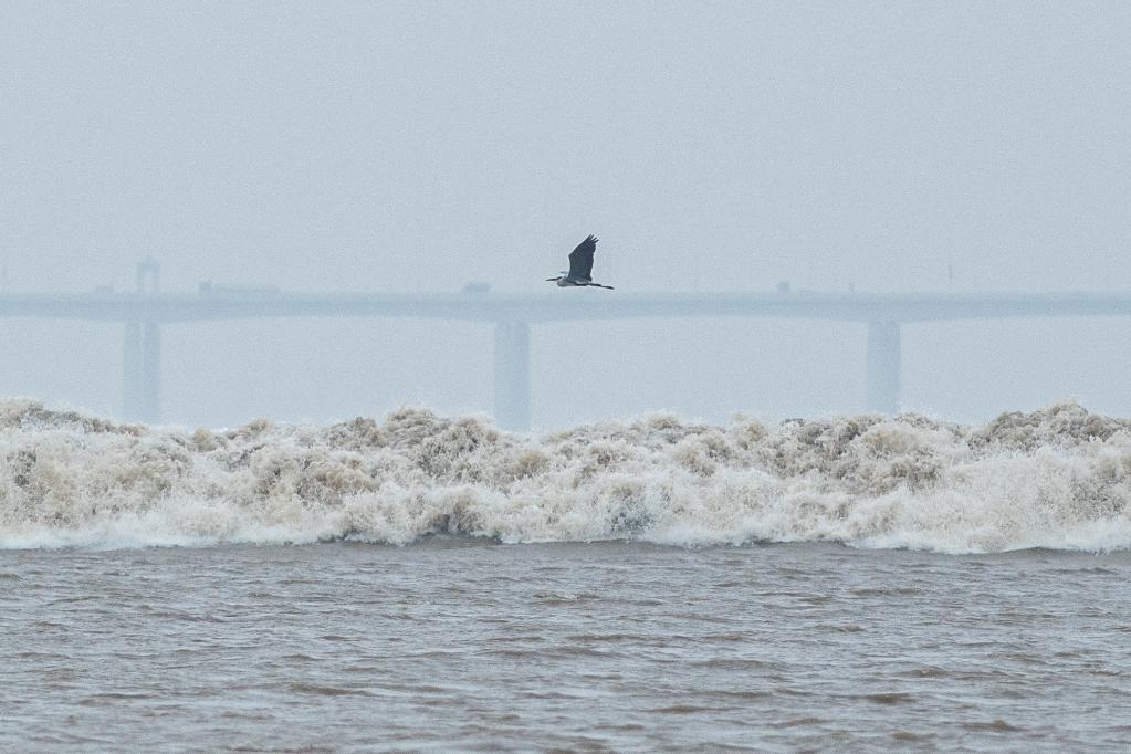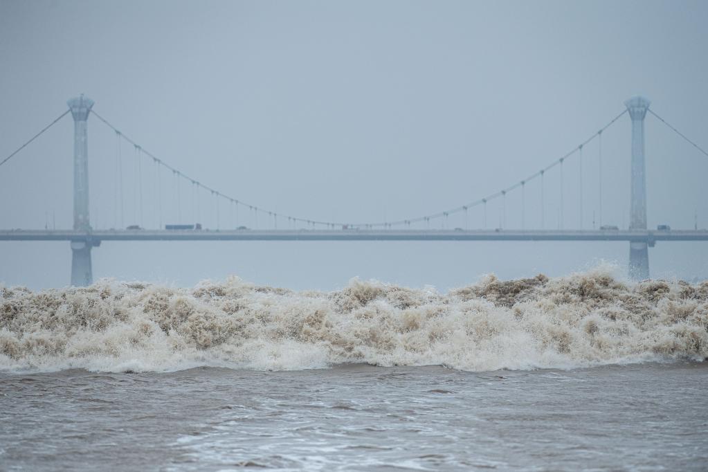 Photo prise le 13 septembre 2022 du mascaret du fleuve Qiantang à Hangzhou, dans la province chinoise du Zhejiang (est). (Photo : Jiang Han)