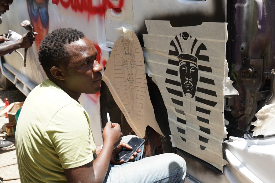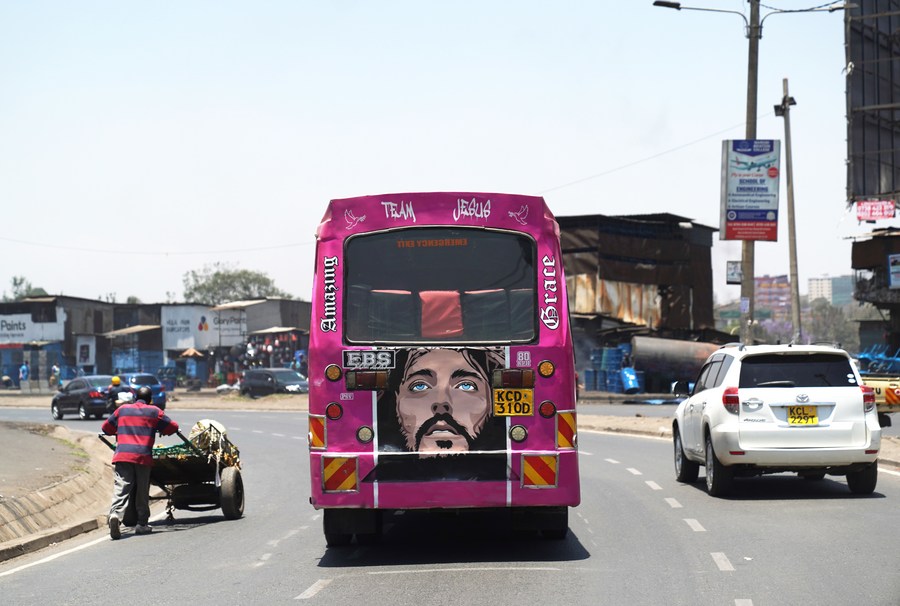 NAIROBI, 29 octobre (Xinhua) -- Les taxis privés partagés, connus sous le nom de matatus, sont le principal moyen de transport public sur diverses routes d'Afrique de l'Est. Selon le ministère kényan des Transports, environ 60% de la population kényane se sert des matatus comme moyen de transport. Au Kenya, le matatu est devenu une culture. (Xinhua/Dong Jianghui)