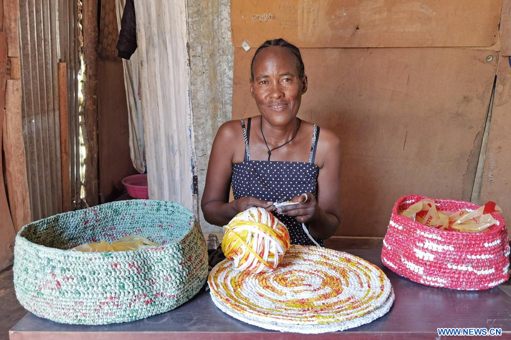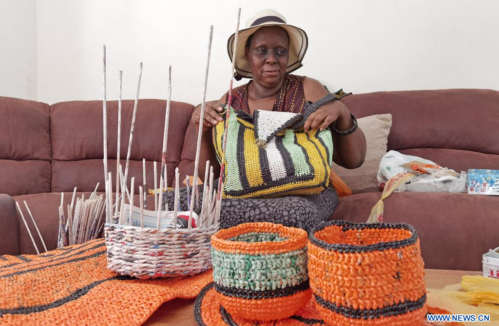WINDHOEK, 30 octobre (Xinhua) -- Belinda Kaaronda et des objets d'artisanats qu'elle a fabriqués à Windhoek en Namibie, le 28 octobre 2022. Dans la capitale namibienne, des mères célibataires sont formées par Mammadu Trust, une organisation à but non lucratif, dans la fabrication de sacs en plastique et d'accessoires de crochet. (Xinhua/Kaula Nhongo)