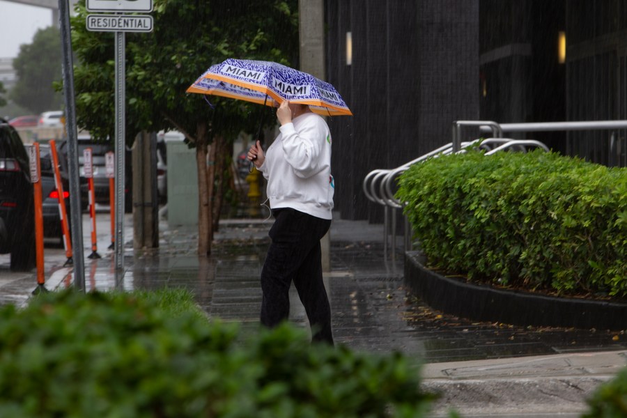 Une femme marche sous la pluie à Miami, en Floride, aux Etats-Unis, le 27 septembre 2022. (Monica McGivern/Xinhua)