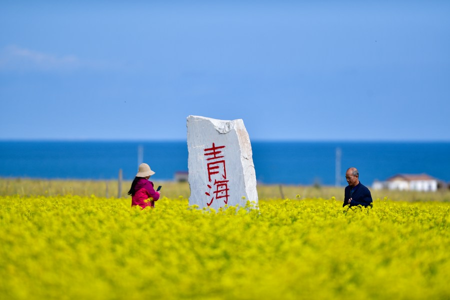 Des touristes se promenant dans des champs de colza le long du lac Qinghai, dans la province chinoise du Qinghai (nord-ouest), le 14 septembre 2019. (Photo : Zhang Long)