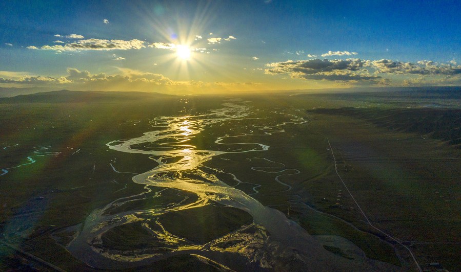 Photo aérienne de la zone humide de la rivière Buh près du lac Qinghai, dans la province chinoise du Qinghai (nord-ouest), le 18 juillet 2020. (Photo : Yang Tao)