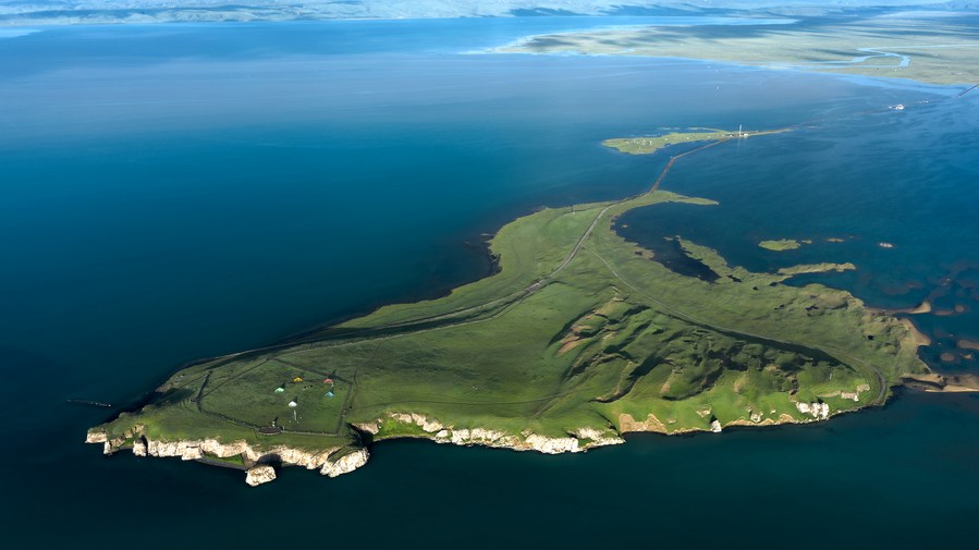 Photo aérienne de la zone humide de l'île aux oiseaux sur le lac Qinghai, dans la province chinoise du Qinghai (nord-ouest), le 1er juillet 2021. (Photo : Xing Zhi)