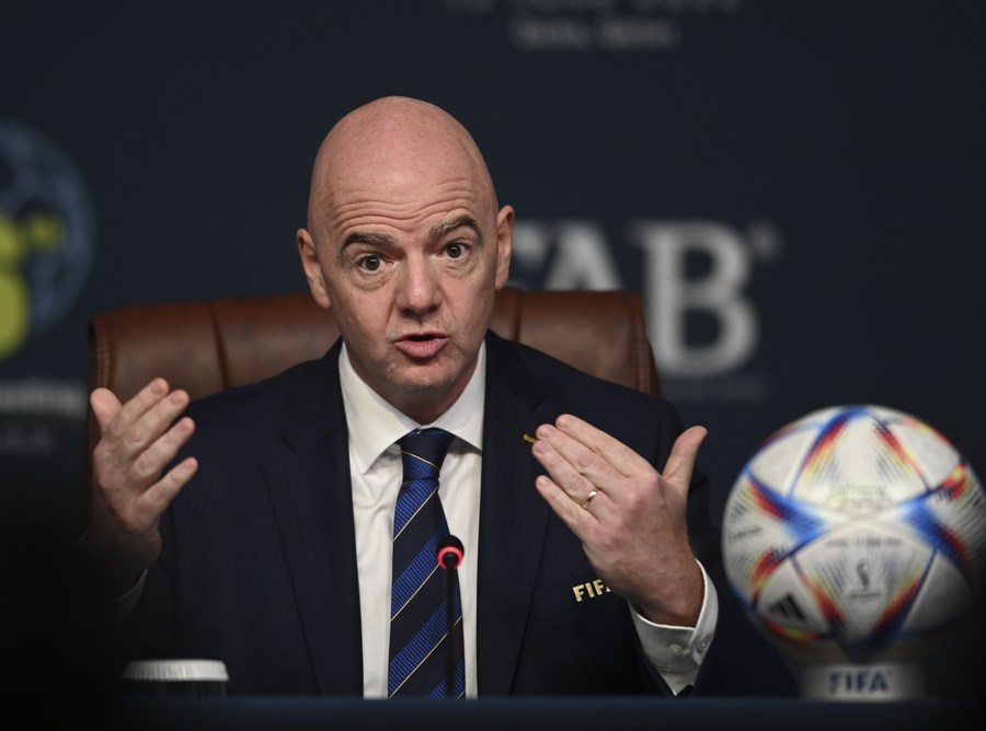 Le président de la FIFA, Gianni Infantino, prend la parole lors d'une conférence de presse pour la 136e Assemblée générale annuelle de l'International Football Association Board (IFAB) à Doha, capitale du Qatar, le 13 juin 2022. (Xinhua/Nikku)