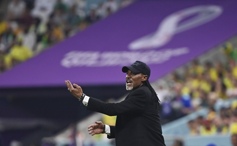 LUSAIL, 2 décembre (Xinhua) -- Rigobert Song, entraîneur de l'équipe du Cameroun, donne des indications sur le terrain lors du match du groupe G de sa sélection contre le Brésil lors de la Coupe du monde de football 2022 au stade Lusail à Lusail, au Qatar, le 2 décembre 2022. (Xinhua/Chen Cheng)
