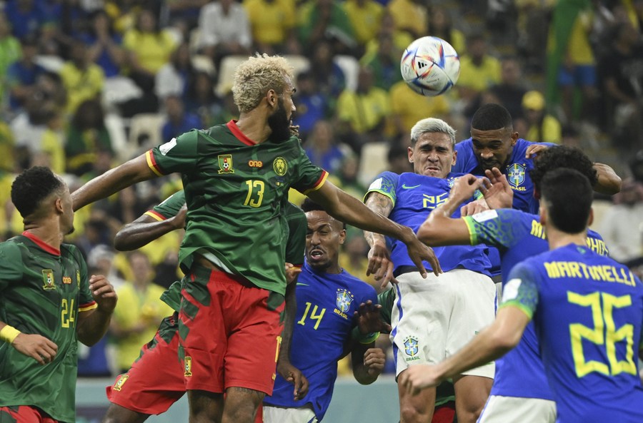 Le joueur brésilien Pedro (2e à droite en haut) saute pour une tête lors du match du groupe G entre le Cameroun et le Brésil lors de la Coupe du monde de football 2022 au stade Lusail à Lusail, au Qatar, le 2 décembre 2022. (Xinhua/Li Ga)