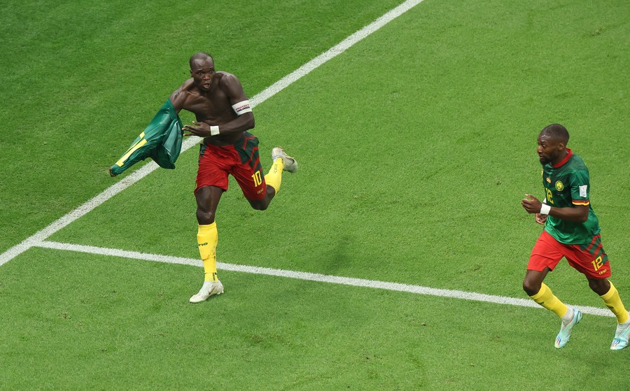 L'attaquant camerounais Vincent Aboubakar (à gauche) célèbre son but marqué, le seul lors du match du groupe G de la Coupe du monde de football 2022 entre le Cameroun et le Brésil au stade Lusail à Lusail, au Qatar, le 2 décembre 2022. (Xinhua/Han Yan)■