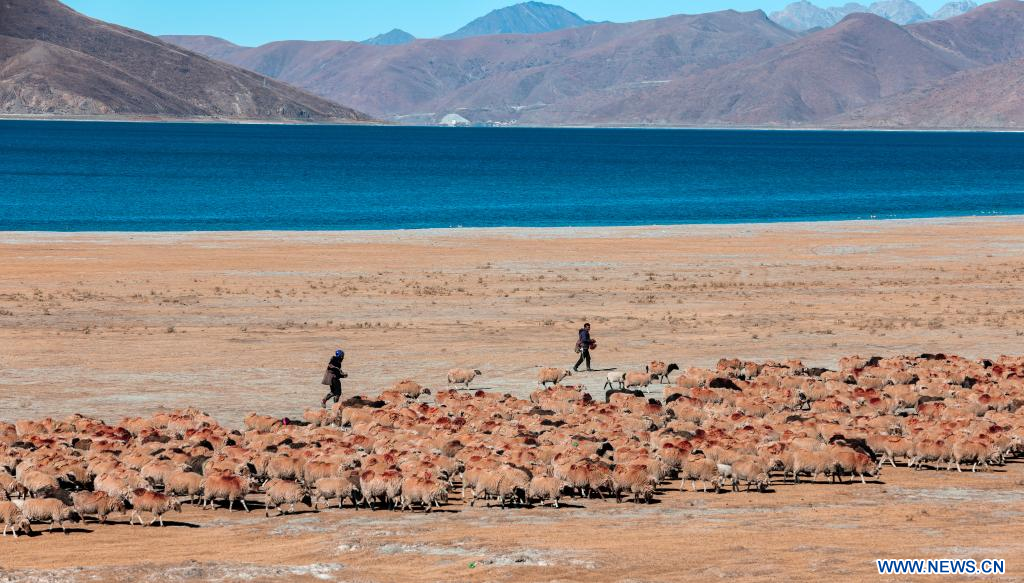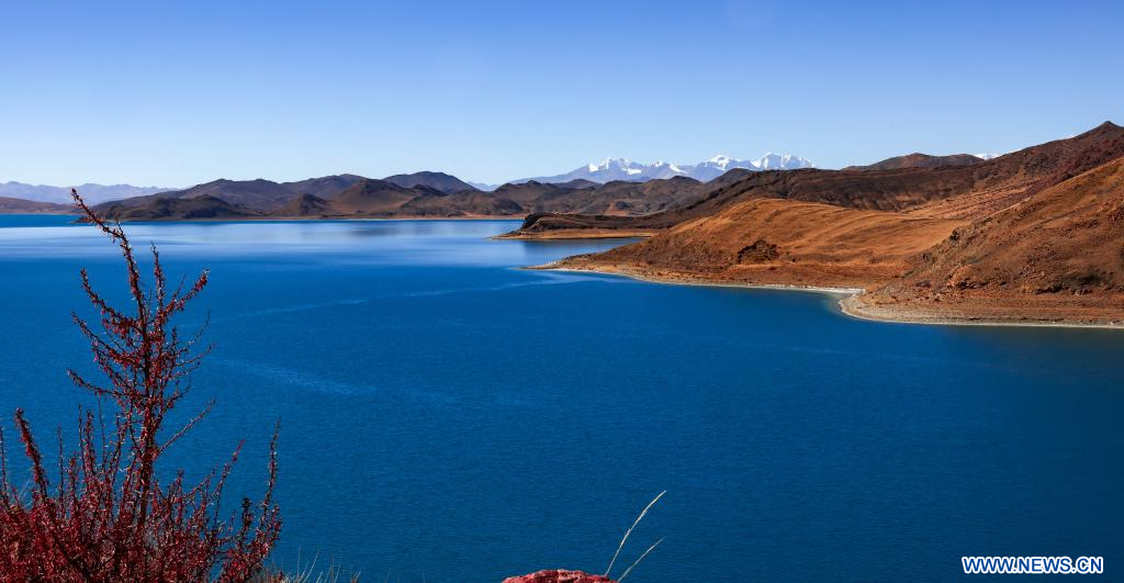 LHASSA, 13 décembre (Xinhua) -- Paysage du lac Yamdrok dans le district de Nagarze de la ville de Shannan, dans la région autonome du Tibet (sud-ouest de la Chine), le 11 décembre 2022. (Photo : Jiang Fan)