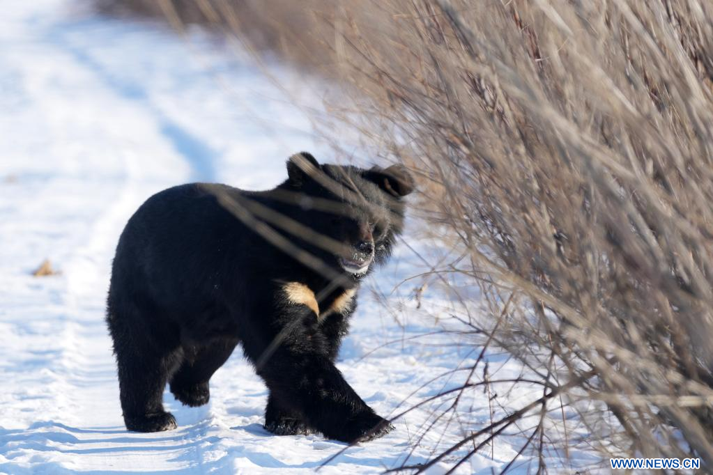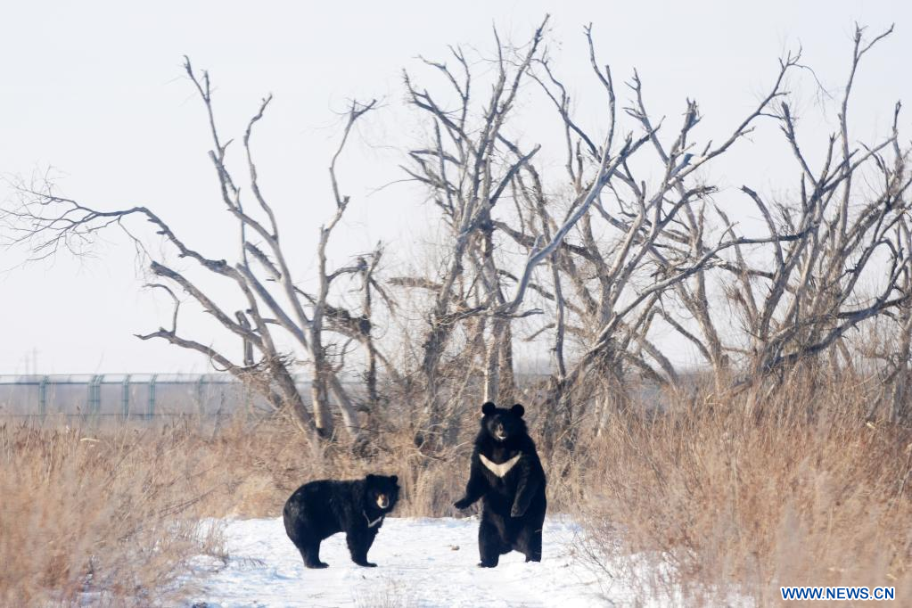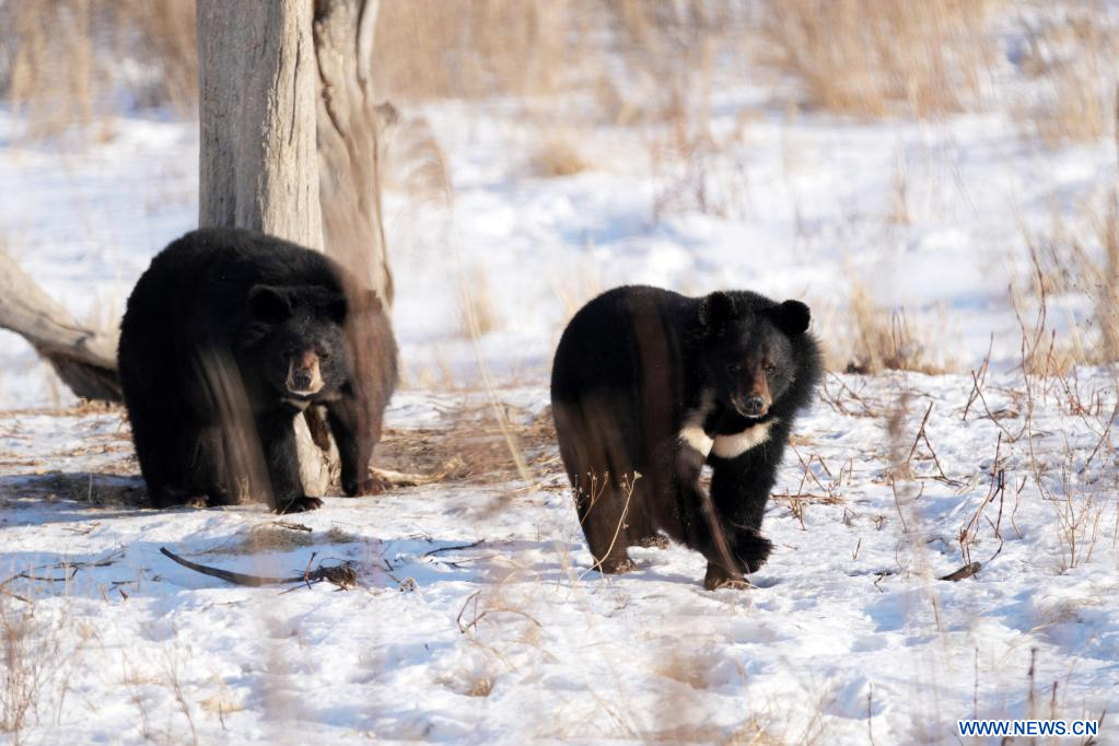 FUYUAN, 11 janvier (Xinhua) -- Des ours noirs dans un parc à ours dans la ville de Fuyuan, dans la province chinoise du Heilongjiang (nord-est), le 10 janvier 2023. (Photo : Wang Jianwei)