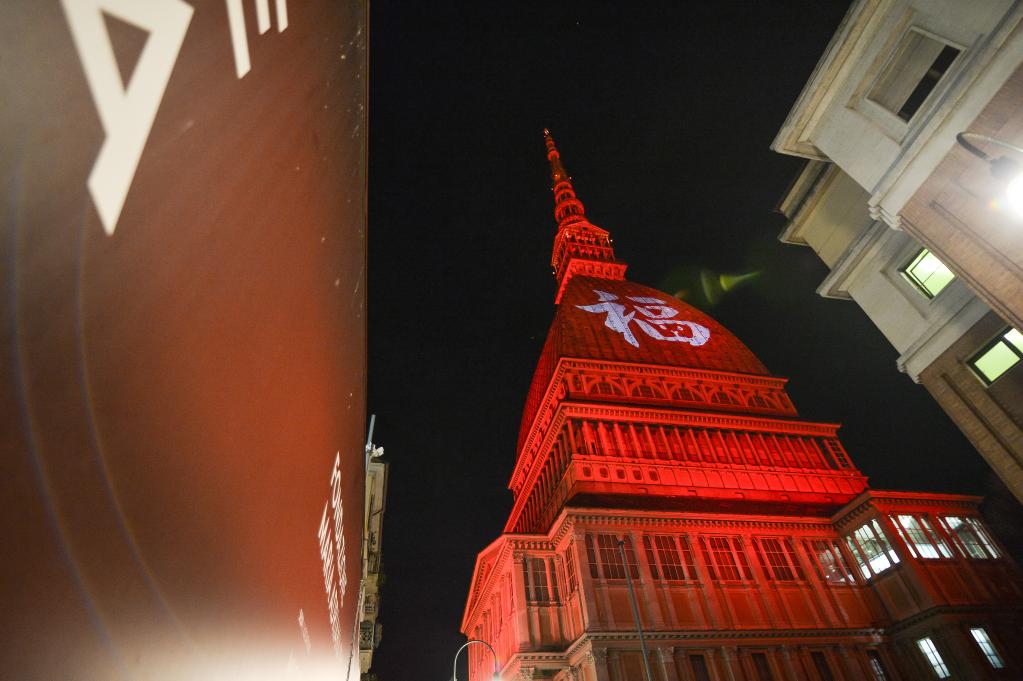 Le caractère chinois "fu", qui signifie "bonne fortune", est projeté sur le monument Mole Antonelliana pour célébrer le Nouvel An chinois à Turin, en Italie, le 21 janvier 2023. (Xinhua/Federico Tardito)