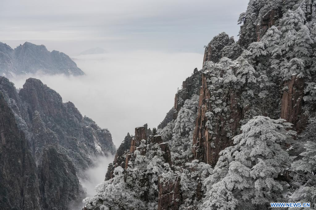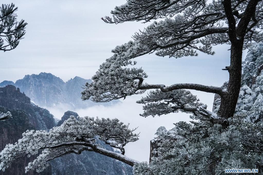 HUANGSHAN, 15 février (Xinhua) -- Photo du paysage de givre sur le mont Huangshan, dans la province chinoise de l'Anhui (est), le 14 février 2023. Le paysage de givre est apparu mardi sur le mont Huangshan après une chute soudaine de la température de l'air. (Photo : Shui Congze)