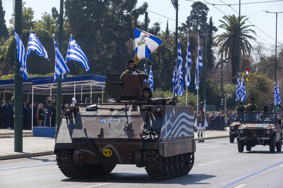 ATHENES, 26 mars (Xinhua) -- Des véhicules militaires au cours d'un défilé militaire pour célébrer la Journée de l'indépendance à Athènes en Grèce, le 25 mars 2023. (Xinhua/Marios Lolos)