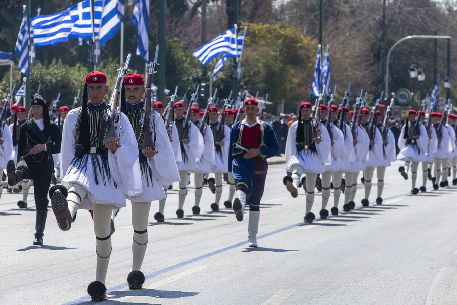 Des membres de la Garde présidentielle grecque défilent pour célébrer la Journée de l'indépendance, à Athènes en Grèce, le 25 mars 2023. (Xinhua/Marios Lolos)