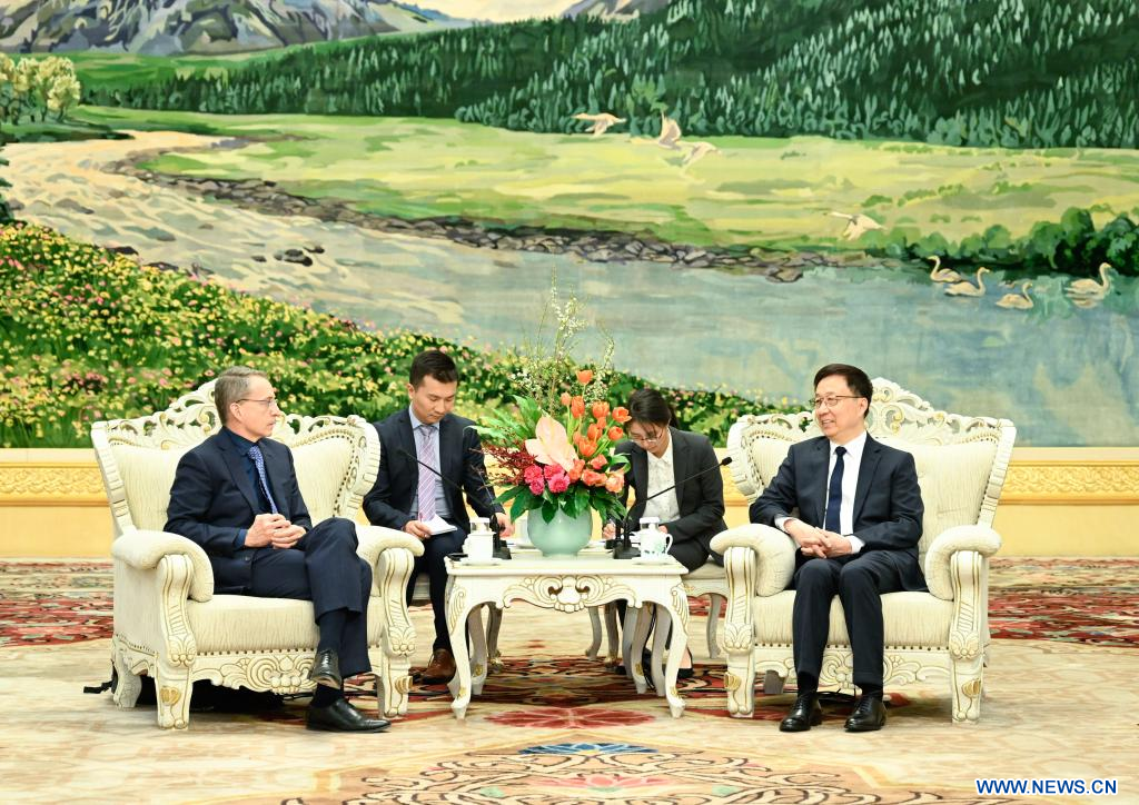 BEIJING, 13 avril (Xinhua) -- Le vice-président chinois, Han Zheng, a rencontré mercredi le PDG d'Intel, Pat Gelsinger, à Beijing, déclarant que la Chine continuerait à promouvoir un environnement des affaires axé sur le marché et fondé sur la loi.