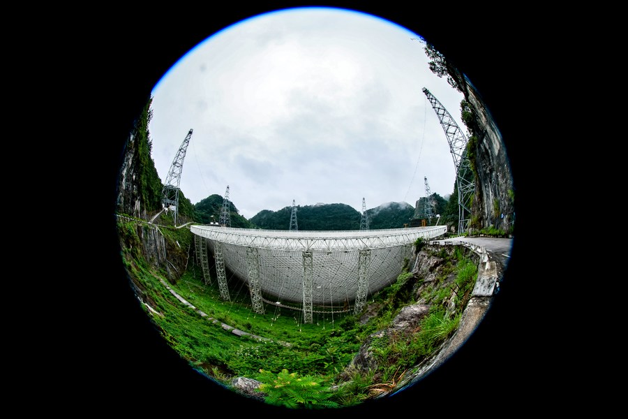 Photo prise avec une lentille fish-eye du radiotélescope sphérique de 500 mètres d'ouverture (Five-hundred-meter Aperture Spherical radio Telescope, FAST) en maintenance dans la province chinoise du Guizhou (sud-ouest), le 22 juin 2023. (Photo : Ou Dongqu)