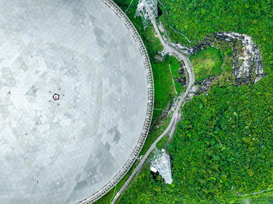 Le radiotélescope sphérique de 500 mètres d'ouverture (Five-hundred-meter Aperture Spherical radio Telescope, FAST) en maintenance dans la province chinoise du Guizhou (sud-ouest), le 22 juin 2023. (Photo : Ou Dongqu)