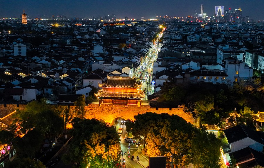 Photo aérienne d'une vue nocturne de la porte Changmen, à Suzhou, dans la province chinoise du Jiangsu (est), le 10 avril 2023. Suzhou, une ville avec une histoire de plus de 2.500 ans, est qualifiée de paradis sur terre selon un célèbre adage chinois. (Photo : Li Bo)