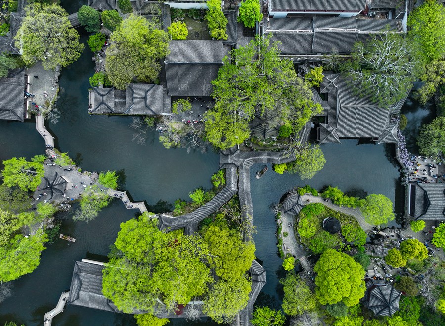 Photo aérienne d'une vue du Jardin de la Politique des Simples, à Suzhou, dans la province chinoise du Jiangsu (est), le 5 avril 2023. Suzhou, une ville avec une histoire de plus de 2.500 ans, est qualifiée de paradis sur terre selon un célèbre adage chinois. (Photo : Li Bo)