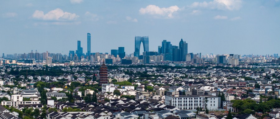 Photo aérienne d'une vue de la ville de Suzhou, dans la province chinoise du Jiangsu (est), le 4 juillet 2023. Suzhou, une ville avec une histoire de plus de 2.500 ans, est qualifiée de paradis sur terre selon un célèbre adage chinois. (Photo : Li Bo) ■