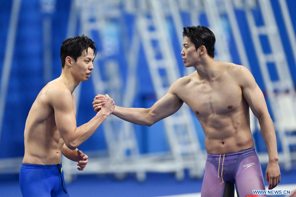 HANGZHOU, 26 septembre (Xinhua) -- Wang Shun de la Chine (à droite) et Kim Woomin de la République de Corée après la finale du relais 4x200 libre masculin de natation aux 19es Jeux asiatiques, à Hangzhou, dans la province chinoise du Zhejiang (est), le 25 septembre 2023. (Photo : Xue Yuge)
